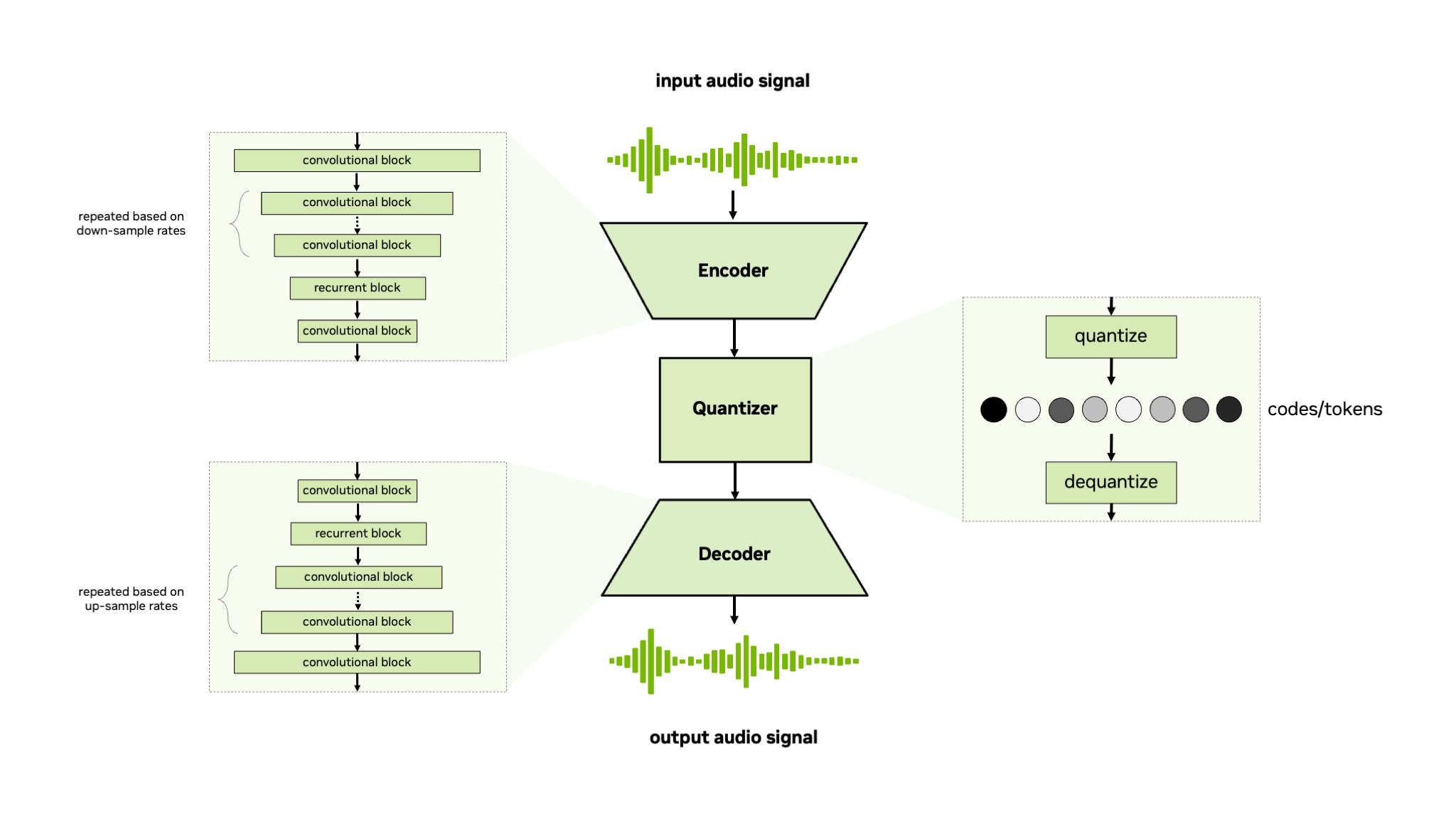The NeMo Audio Codec model is a non-autoregressive convolutional encoder-quantizer-decoder model for coding or tokenization of raw audio signals or mel-spectrogram features. The NeMo Audio Codec model supports residual vector quantizer (RVQ) [TTS-MODELS11] and finite scalar quantizer (FSQ) [TTS-MODELS6] for quantization of the encoder output. This model is trained end-to-end using generative loss, discriminative loss, and reconstruction loss, similar to other neural audio codecs such as SoundStream [TTS-MODELS11] and EnCodec [TTS-MODELS2]. For further information refer to the Audio Codec Training tutorial in the TTS tutorial section.