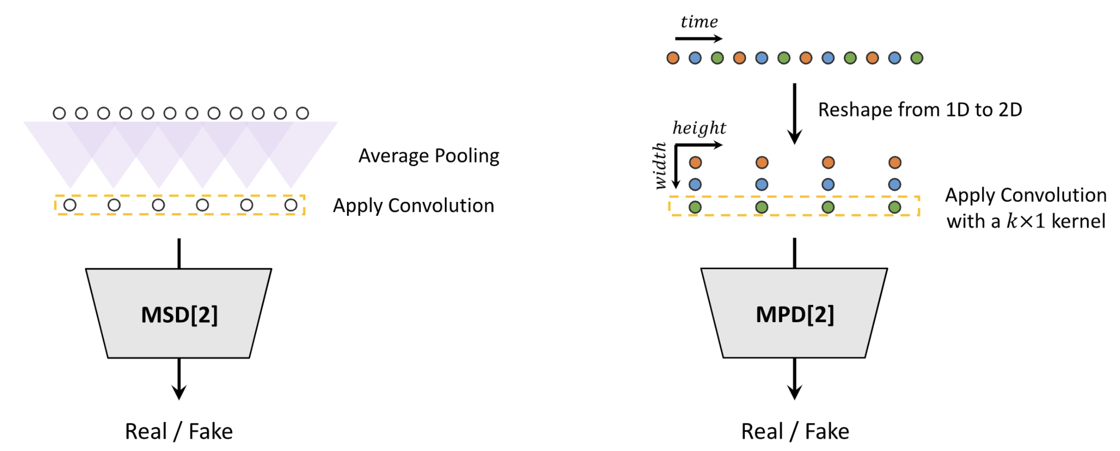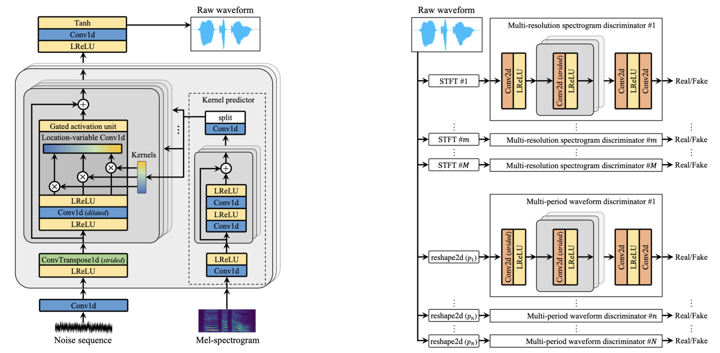 UnivNet is a neural vocoder that synthesizes high-fidelity waveforms in real time. It consists of a generator and two waveform discriminators (multi-period and multi-resolution). The generator is inspired by MelGAN, and adds a location-variable convolution (LVC) to efficiently capture the local information of the log-mel-spectrogram. The kernels of the LVC layers are predicted using a kernel predictor that takes as input the log-mel-spectrograms. The architecture of the generator is shown below (left). Multi-resolution spectrogram discriminator (MRSD) uses multiple linear spectrogram magnitudes with various temporal and spectral resolutions so that generating high-resolution signals over the full-band is possible. Multi-period waveform discriminator (MPWD) is added to improve detailed adversarial modeling in temporal domain. The architecture of the discriminators is shown below (right). Please refer to [TTS-MODELS3] for details.