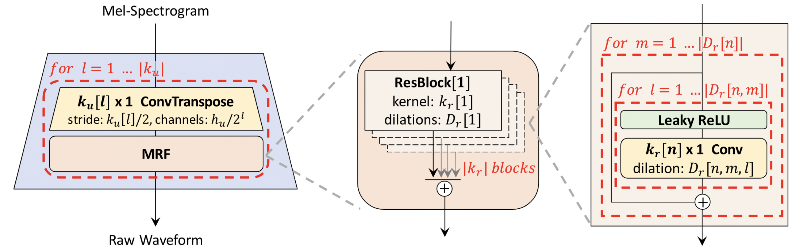 HiFi-GAN focuses on designing a vocoder model that efficiently synthesizes raw waveform audios from the intermediate mel-spectrograms. It consists of one generator and two discriminators (multi-scale and multi-period). The generator and discriminators are trained adversarially with two additional loses for improving training stability and model performance. The generator is a fully convolutional neural network which takes a mel-spectrogram as input and upsamples it through transposed convolutions until the length of the output sequence matches the temporal resolution of raw waveforms. Every transposed convolution is followed by a multi-receptive field fusion (MRF) module. The architecture of the generator is shown below (left). Multi-period discriminator (MPD) is a mixer of sub-discriminators, each of which only accepts equally spaced samples of an input audio. The sub-discriminators are designed to capture different implicit structures from each other by looking at different parts of an input audio. While MPD only accepts disjoint samples, multi-scale discriminator (MSD) is added to consecutively evaluate the audio sequence. MSD is a mixer of 3 sub-discriminators operating on different input scales (raw audio, x2 average-pooled audio, and x4 average-pooled audio). HiFi-GAN could achieve both higher computational efficiency and sample quality than the best publicly available auto-regressive or flow-based models, such as WaveNet and WaveGlow. Please refer to [TTS-MODELS5] for details.