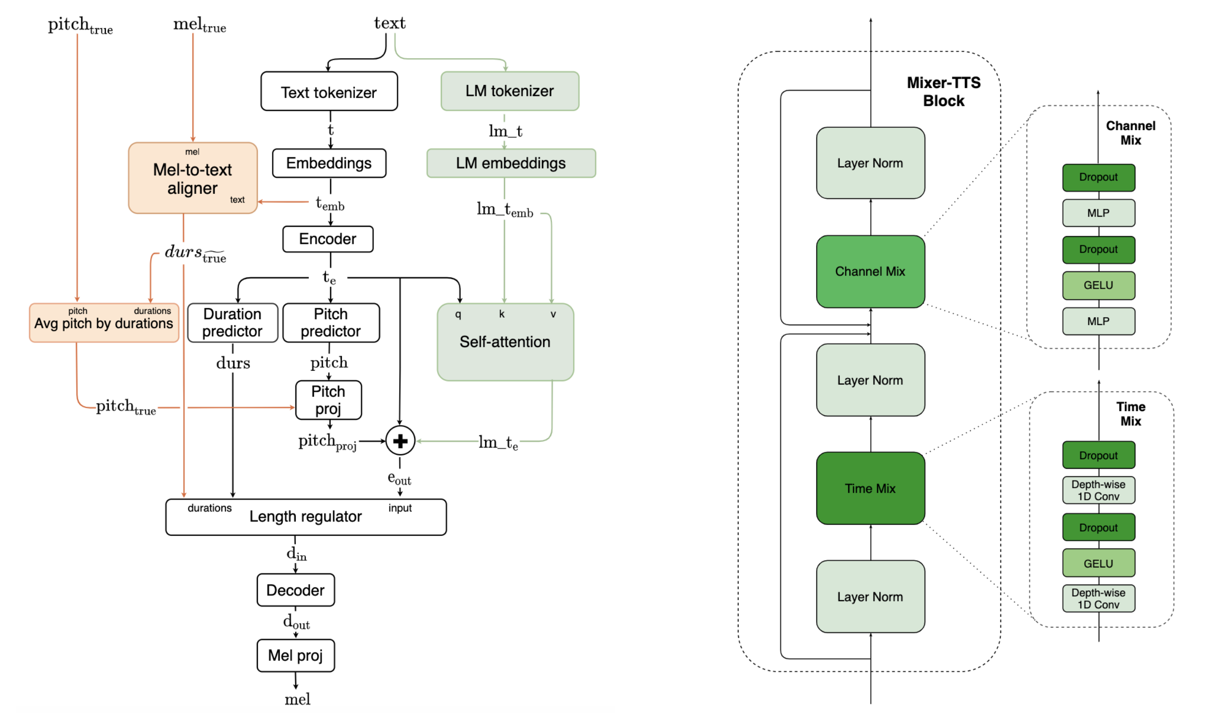 Mixer-TTS is a non-autoregressive model for mel-spectrogram generation. The model is based on MLP-Mixer architecture adapted for speech synthesis. The basic Mixer-TTS contains pitch and duration predictors, with the latter being trained with supervised TTS alignment framework. Alongside the basic model, we propose the extended version, Mixer-TTS-X, which additionally uses token embeddings from a pre-trained language model. Basic Mixer-TTS and its extended version have a small number of parameters and enable much faster speech synthesis compared to the models with similar quality. The model architectures of basic Mixer-TTS is shown below (left). The basic Mixer-TTS uses the same architectures of duration and pitch predictors as FastPitch, but it has two major changes. It replaces all feed-forward transformer-based blocks in the encoder and decoder with new Mixer-TTS blocks (right); it uses an unsupervised speech-to-text alignment framework to train the duration predictor. Please refer to [TTS-MODELS10] for details.