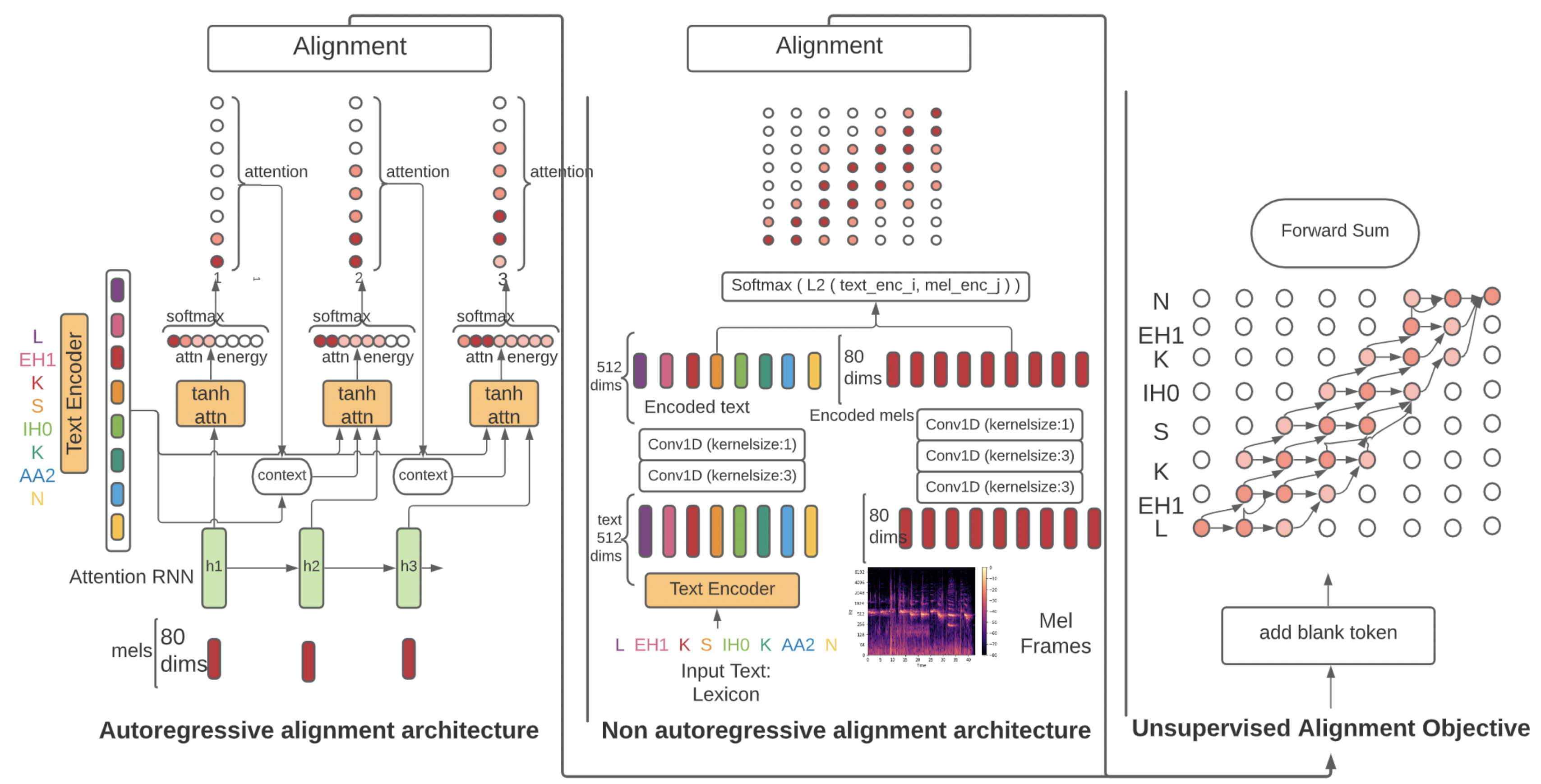 Speech-to-text alignment is a critical component of neural TTS models. Autoregressive TTS models typically use an attention mechanism to learn these alignments on-line. However, these alignments tend to be brittle and often fail to generalize to long utterances and out-of-domain text, leading to missing or repeating words. Most non-autoregressive end-to-end TTS models rely on durations extracted from external sources. RAD-TTS Aligner leverages the alignment mechanism proposed in RAD-TTS and demonstrates its applicability to wide variety of neural TTS models. The alignment learning framework combines the forward-sum algorithm, Viterbi algorithm, and an efficient static prior. RAD-TTS Aligner can improve all tested TTS architectures, both autoregressive (Flowtron, Tacotron 2) and non-autoregressive (FastPitch, FastSpeech 2, RAD-TTS). Specifically, it improves alignment convergence speed, simplifies the training pipeline by eliminating need for external aligners, enhances robustness to errors on long utterances and improves the perceived speech synthesis quality, as judged by human evaluators. The alignment framework is shown below. Please refer to [TTS-MODELS1] for details.
