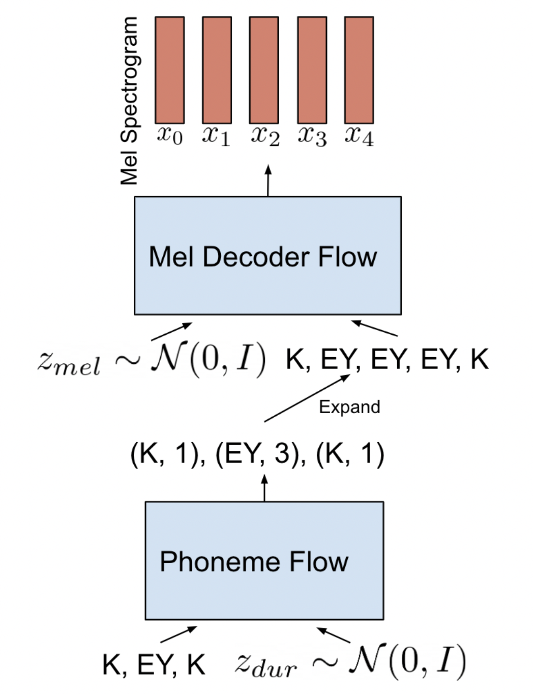 RAD-TTS introduces a predominantly parallel, end-to-end TTS model based on normalizing flows. It extends prior parallel approaches by additionally modeling speech rhythm as a separate generative distribution to facilitate variable token duration during inference. RAD-TTS further designs a robust framework for the on-line extraction of speech-text alignments, which is a critical yet highly unstable learning problem in end-to-end TTS frameworks. Overall, RAD-TTS yields improved alignment quality, better output diversity compared to controlled baselines. The following diagrams summarizes the inference pipeline for RAD-TTS. The duration normalizing flow first samples the phoneme durations which are then used to prepare the input to the parallel Mel-Decoder flow. Please refer to [TTS-MODELS9] for details.