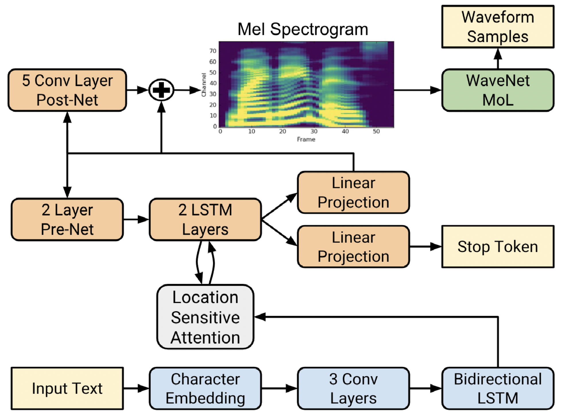 Tacotron 2 consists of a recurrent sequence-to-sequence feature prediction network with attention that maps character embeddings to mel-spectrogram frames, and a modified version of WaveNet as a vocoder that generate time-domain waveform samples conditioned on the predicted mel-spectrogram frames. This system uses mel-spectrograms as the conditioning input to WaveNet instead of linguistic, duration, and F0 features, which shows a significant reduction in the size of the WaveNet architecture. The block diagram of the Tacotron 2 architecture is shown below. Please refer to [TTS-MODELS8] for details.